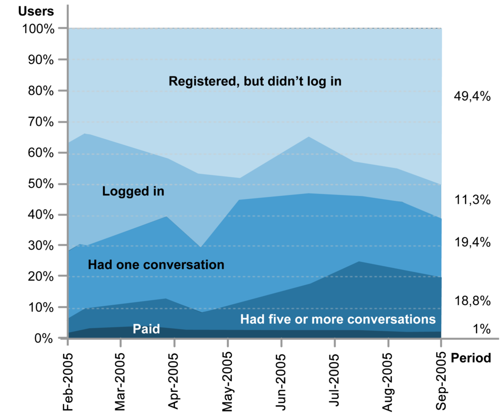 The Cohort Analysis consists in separating users by groups (cohorts) that share certain characteristics or experiences. This analysis was made by the developers of a company called IMVU, who grouped users in the following cohorts: registered, but didn’t log in (should we really call these people users?); logged in, but didn’t participate in a conversation (also not effective users); had at least one conversation (actually used the system); had five or more conversations (regular users); paid for the use of advanced features (intensive users, who recognized the utility of the system to such an extent that they became paying users). The behavior of that system’s users was followed for eight months, according to data presented in the following graphic.