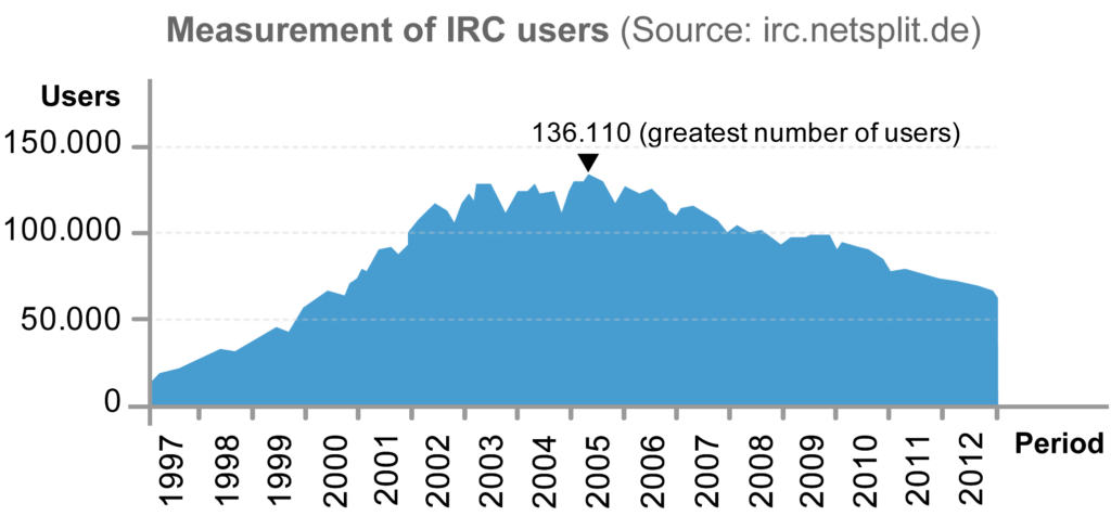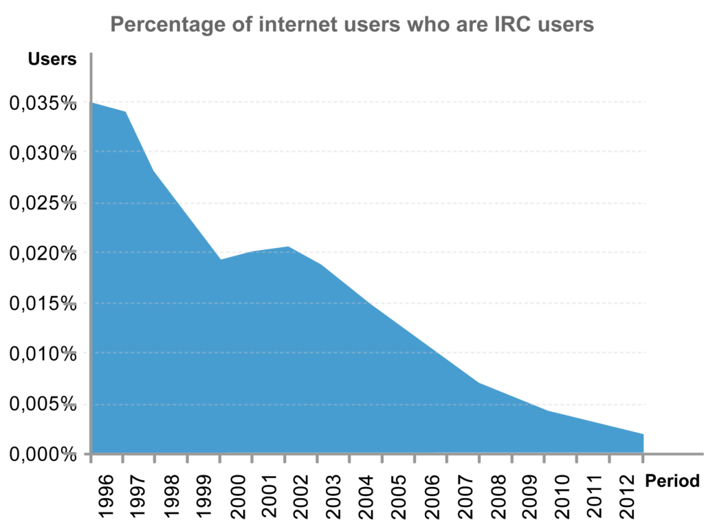 However, this is the wrong interpretation, because the graphic only shows the absolute number of IRC users. When we consider these users in relation to the total of internet users in each year (Internet World Stats, 2012), we observe that the decline in IRC’s popularity was already very clear in 1997.