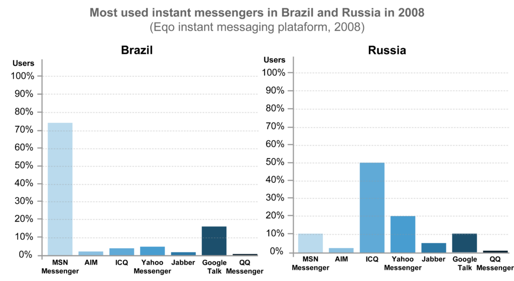 This analysis of the popularity of instant messenger systems in different countries, made in 2008, reveals that in Brazil the MSN Messenger system held a 70% market share and that in Russia ICQ was the most used system, with 50% of users. |