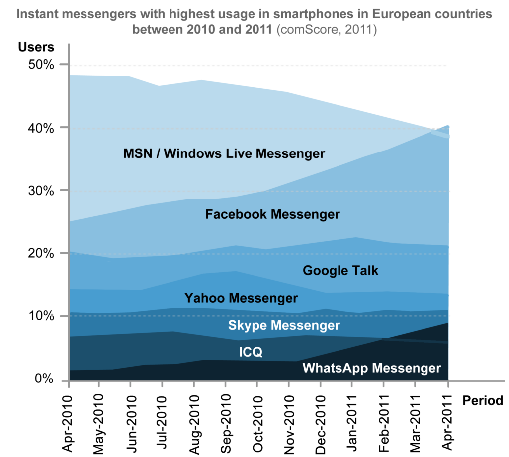 Between April 2010 and April 2011 there was a great increase in the number of users of Facebook’s instant messenger, and a great decrease in the number of users of MSN Messenger, while the popularity of the remaining systems that implement that same medium practically remained stable. This research reveals the competition that was taking place mainly between these two systems and the phenomenon of user migration between them. In this research we can also identify the beginning of the rapid ascension of WhatsApp, which in 2014 became the leader of this market. |