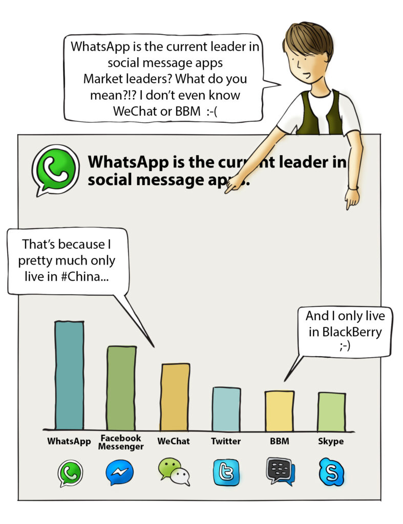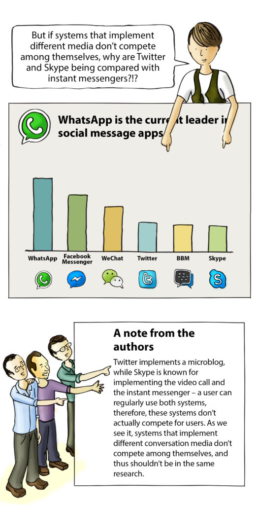 In order to make a market research, we need to identify which systems have a share in that market. We consider that a market is formed by the systems that implement a same conversation medium. However, a few market researches inadvertently include systems that implement different media, such as, for example, those that compare Skype and Twitter. To us, these systems don’t compete; they belong to different markets, and therefore should not be included in the same research.