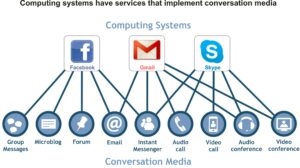 A computing system provides services that implement conversation media. For example, on Facebook, we can publish a message that will be followed by our friends in the “News Feed” service, which is a microblog; through the “Chat” service, we establish private conversations with friends through instant messages; through the “Messages” services we send email messages and can even attach files; and we also talk in a “Group”, through a forum. Another example: Skype has several conversation services that implement different media in order to allow synchronous conversations, among which we recognize instant messenger, voice and video call, audioconference and videoconference. Even Gmail, which in its first versions only had an email service, today contains the implementation of other conversation media, such as instant messenger (Google Talk), voice call, video call, audioconference and videoconference (Hangouts).