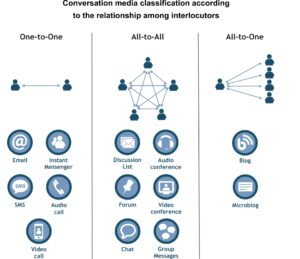 Conversation media also restrict the relationship among interlocutors during a conversation: this relationship can be one-to-one, all-to-all and all-to-one. The relationship among interlocutors is bidirectional, which marks the difference between conversation media and mass communication media, which establish a unidirectional one-to-all relationship, with the communication centered in one emission pole without the possibility of audience feedback.