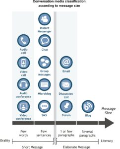 In this book conversation media was distributed over a spectrum according to the expected response time. Kock (2004) did something analogous by comparatively characterizing these media according to their similarity with face-to-face conversation, a criterion she calls “media naturalness”. Since pre-historical times, mankind is biologically adapted to communicate face-to-face, so the bigger the difference between a conversation medium and face-to-face communication, the more obstacles to communication this medium will present, because it will demand more cognitive effort from interlocutors, and, thus, the lesser naturalness it will have. The most natural conversation media are the ones closest to a face-to-face conversation, with video call and videoconference being the most natural of all, because they allow speech, gestures and looks to be conveyed. Asynchronous conversation media that require the use of written language and elaborate messages (such as emails or blogs) are less natural than synchronous media (such as instant messengers), which present quicker responses and language that is more informal and has characteristics of orality that are closer to face-to-face conversation. Moreover, from our point of view, the naturalness of media is related to the expected response time that characterizes the conversation synchronism: the longer the average response time, the more elaborate and literate, and the less natural, the discourse.