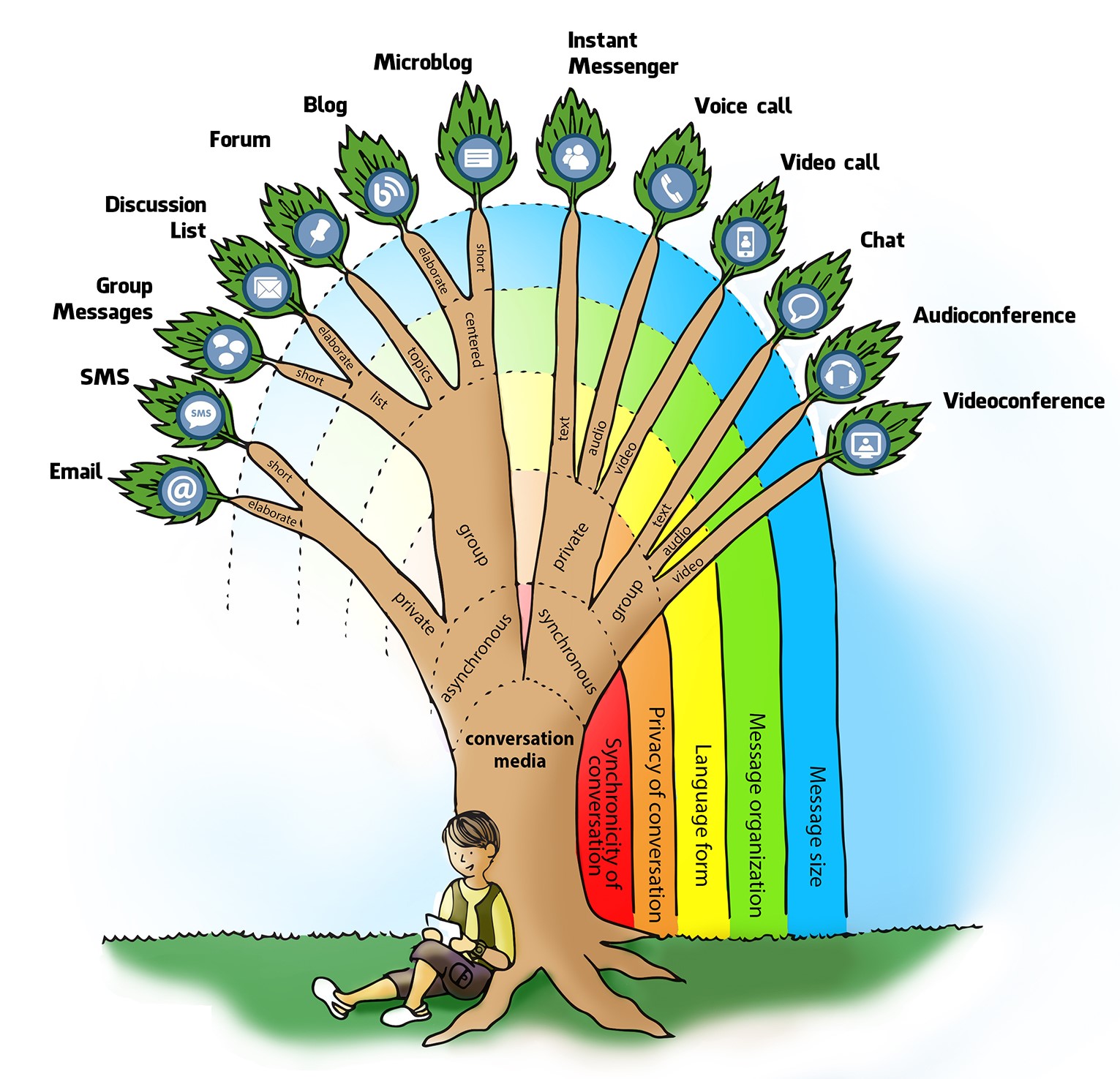 Following the same design adopted in this chapter’s simplified tree, the model in the shape of a mandala found in the beginning of the section “A model of internet conversation media” is another way of representing conversation media differentiation. This design has aided in the composition of our dictionary with the definition of conversation media.