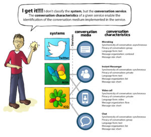 Last century, the usual thing was for one system to implement only one conversation medium, so it was common for us to classify systems as an “email system” or a “videoconference system”. With the development of the web, and particularly of the web 2.0, the most common thing now is for a system to implement several conversation media, such as social network systems do. As a consequence, it became impossible to classify computing systems according to the conversation media they implement. We recognize that conversation services are the units that are classified according to the conversation medium.