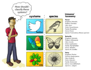 Taxonomies are employed in different areas. In Biology, taxonomy is fundamental for the identification, description, nomenclature and classification of living beings. For a biologist, the taxonomy of living beings supports the identification of characteristics that differentiate, for example, a human being from a chimpanzee.